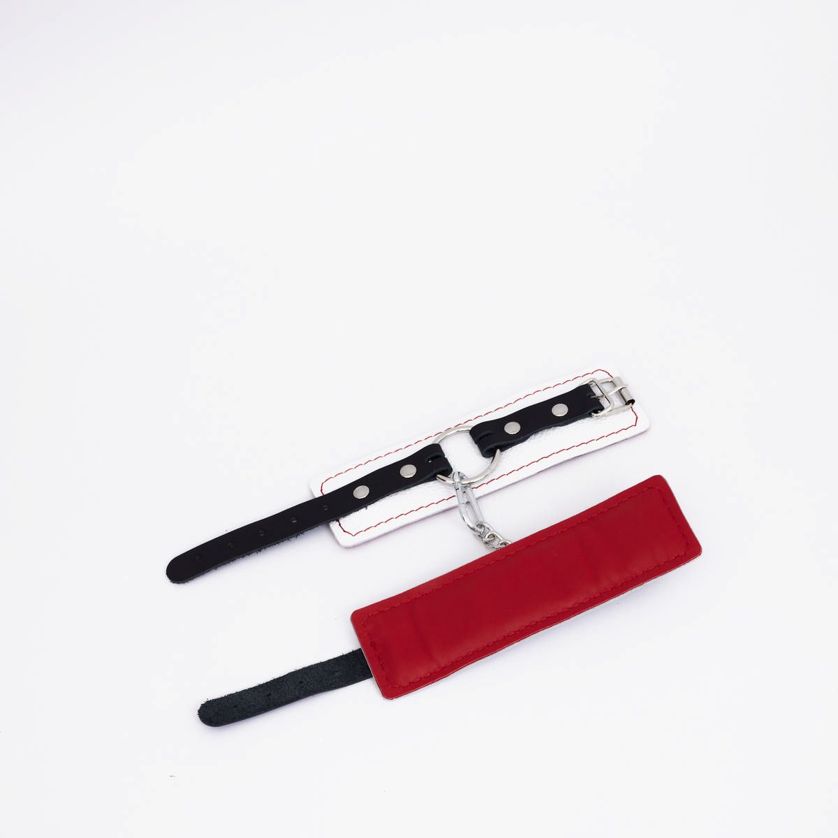 Изделие состоит из двух слоев натуральной кожи : основной слой белого цвета – лицевая часть, и подкладка красного цвета с мягким наполнителем , которая обеспечивает комфортное и безопасное использование, не натирая кожу. Декоративная красная строчка добавляет изделию стильный акцент, подчеркивая его элегантность и игривость.