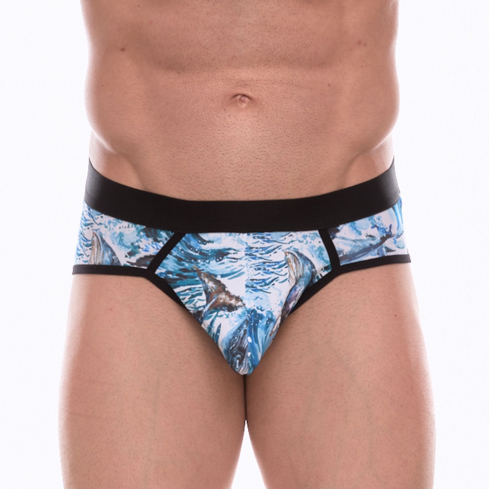 ОписаниеМужские трусы-стринги с принтом в виде китов в волнах.