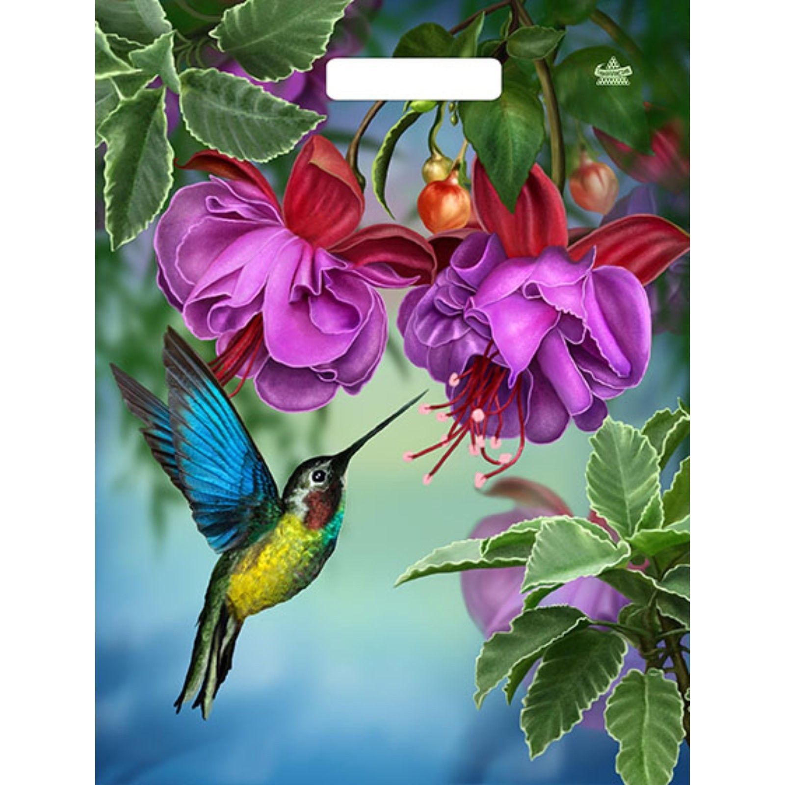 ОписаниеПакет с принтом в виде колибри в цветах с вырубной ручкой (31х40 см).