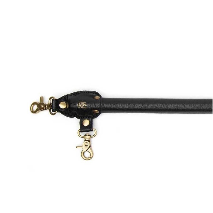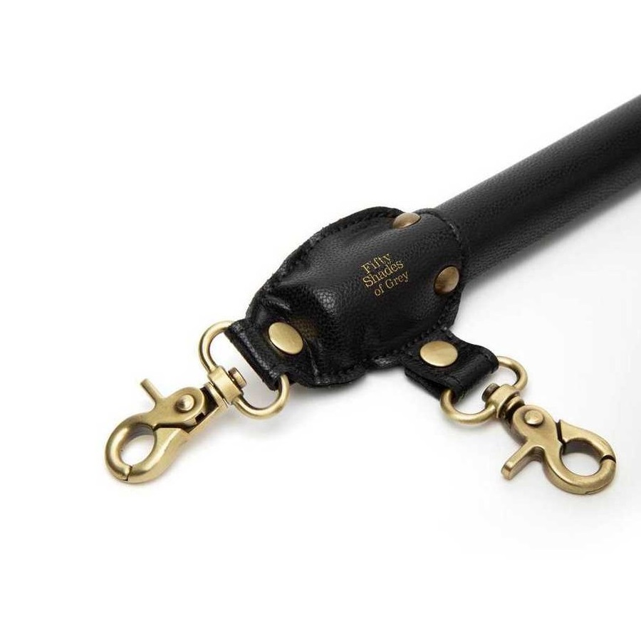 Распорка из серии 50 Оттенков серого - это элемент для легкой фиксации партнера и подойдет для чувственных экспериментов в постели. Общая длина распорки 51 см. Аксессуар выполнен из искусственной кожи с металлической фурнитурой на обеих сторонах. Всего у распорки 4 карабина, которые помогут для закрепления ваших любимых наручников или оков.