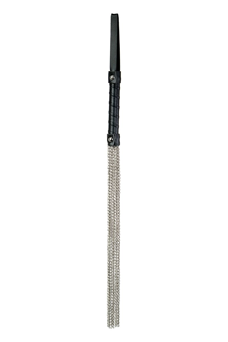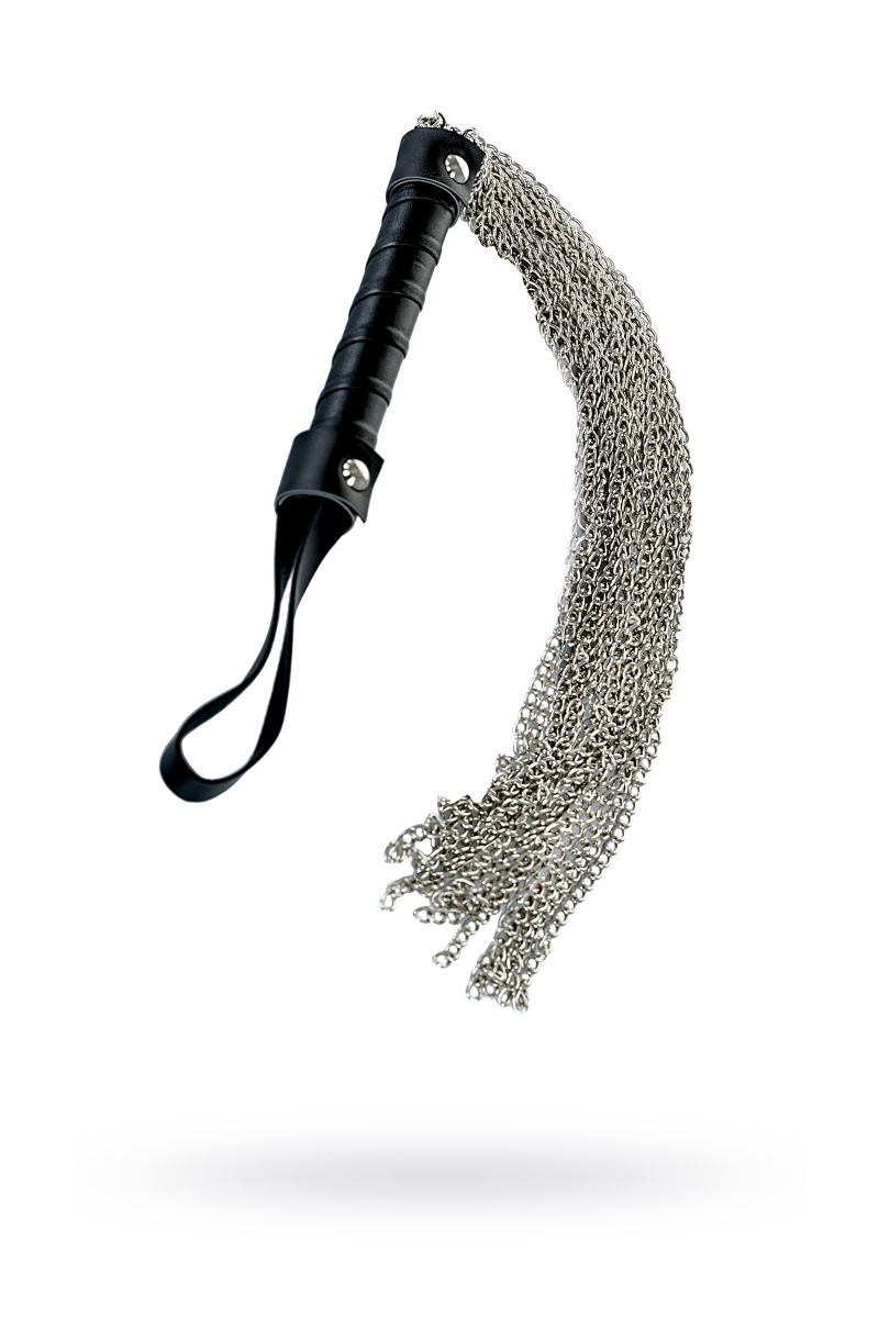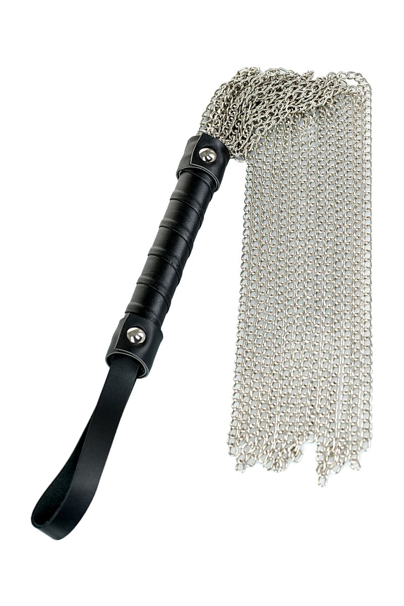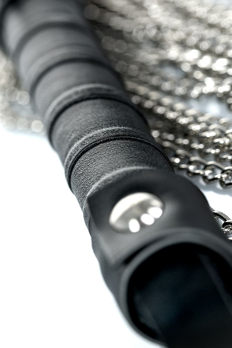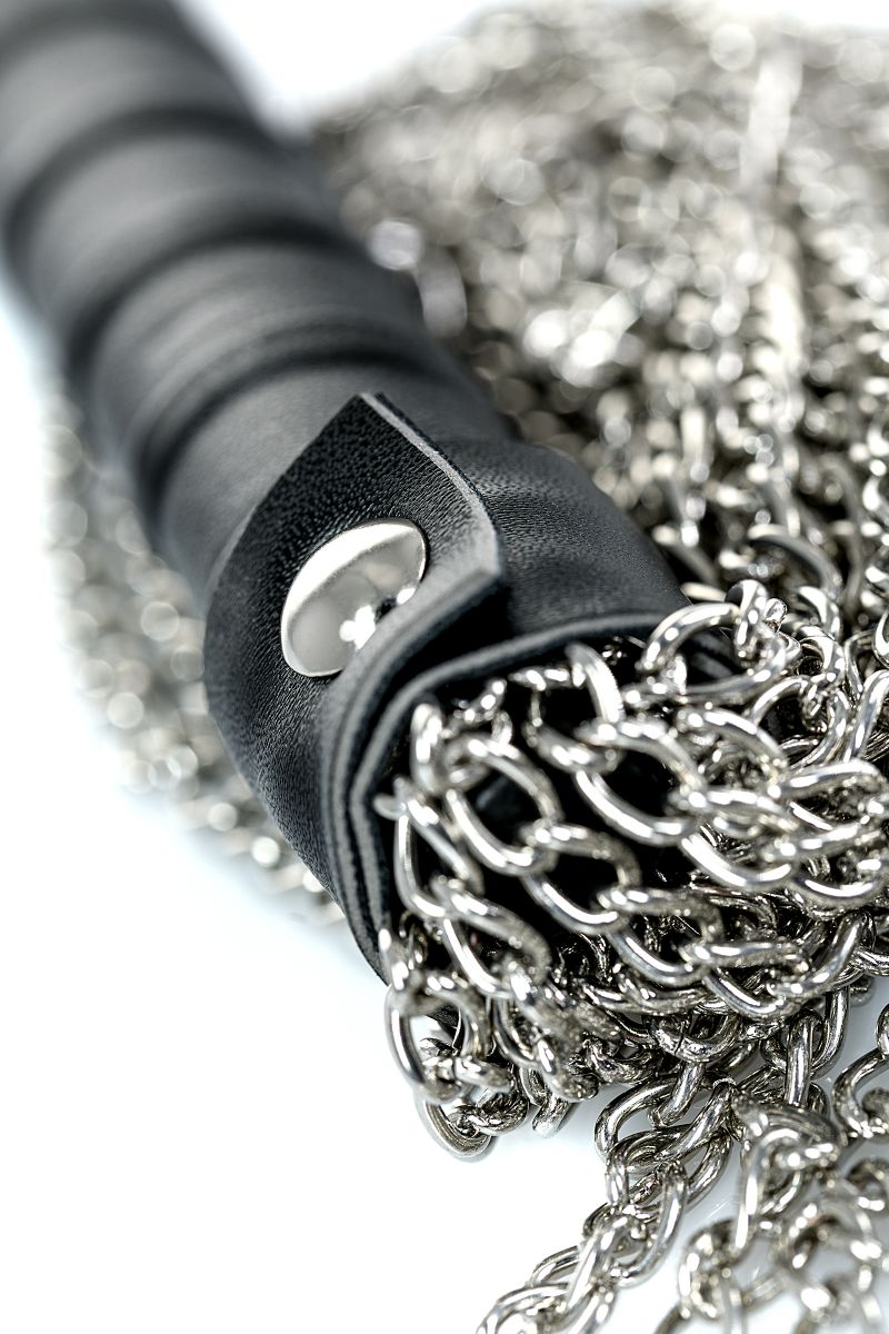 Ударная часть этого флоггера состоит из длинных металлических цепочек, которые обеспечат особенно сильное воздействие. Металл будет одновременно холодить и разогревать кожу, а также добавит приятных болевых ощущений в руках умелого мастера. Ручка плетки покрыта переработанной кожей для более комфортного расположения при использовании. Общая длина составляет 53, 5 см.