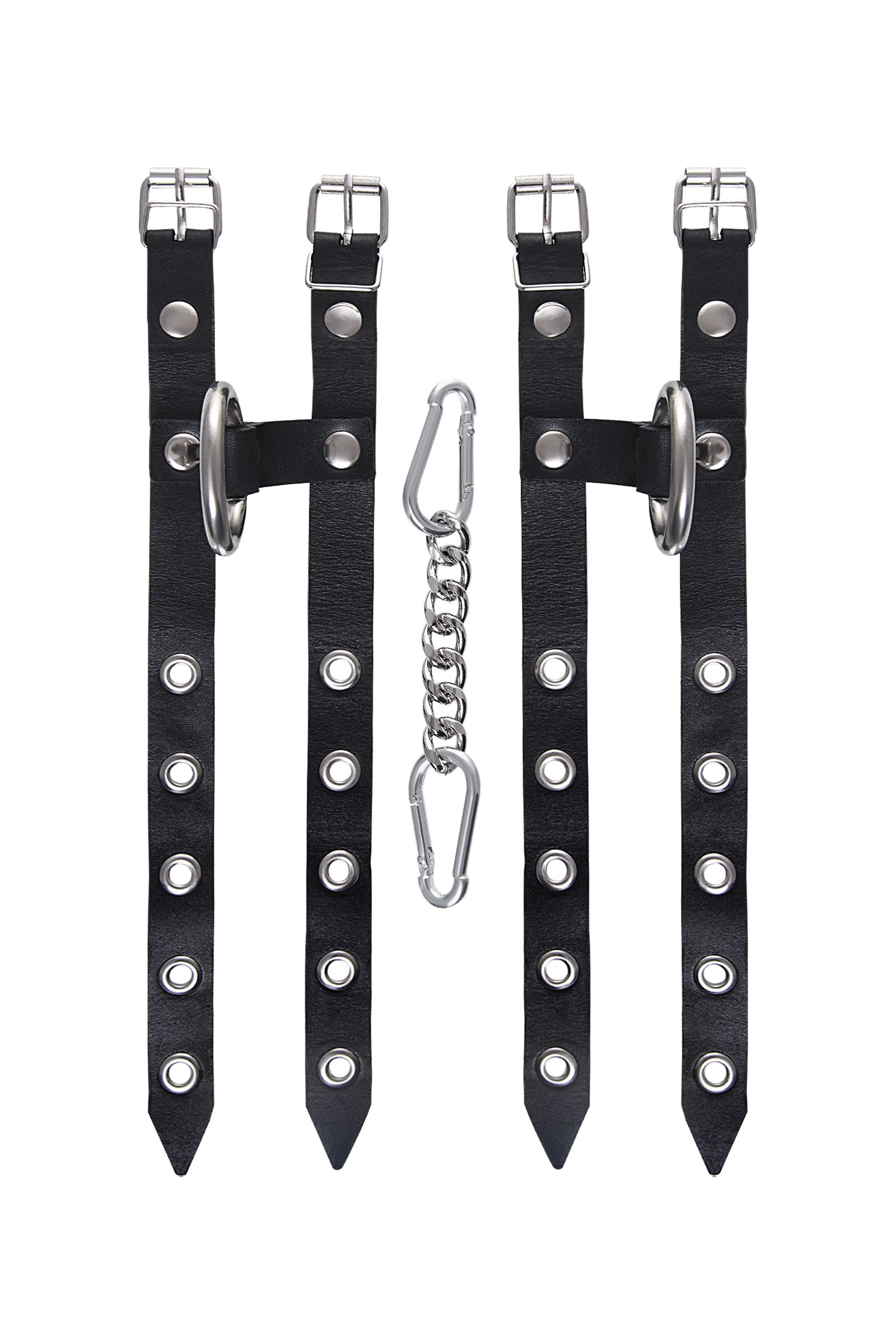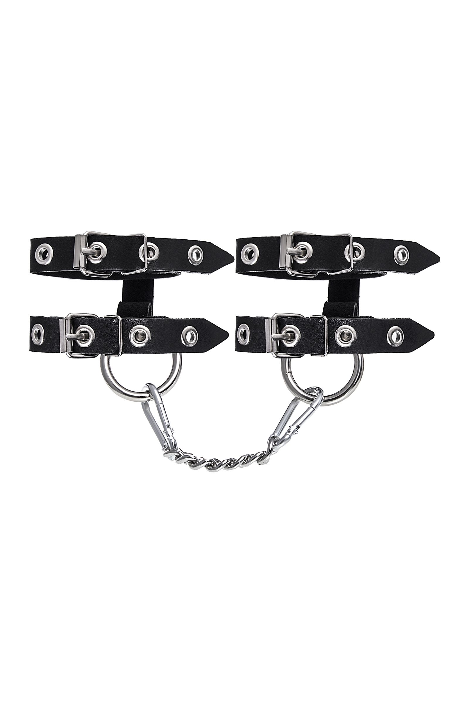 Наличие двух колец и карабинов, соединенных между собой металлической цепочкой, позволяет использовать изделие как раздельно – аксессуар-манжеты, так и как наручники для фиксации. К широким металлическим кольцам также можно присоединить и другие аксессуары при помощи карабинов.