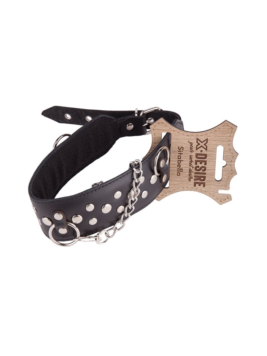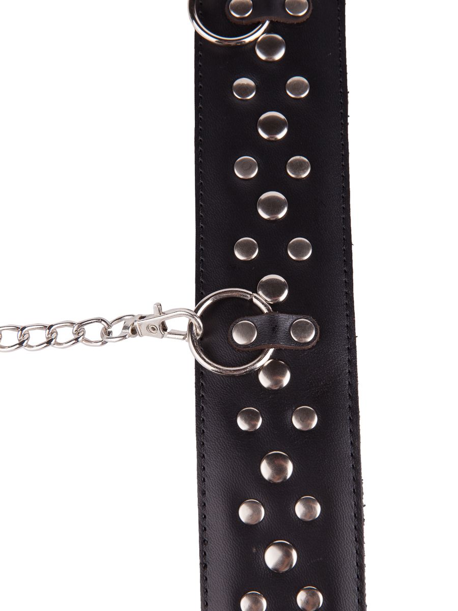 Чёрный кожаный ошейник с карабином и поводком