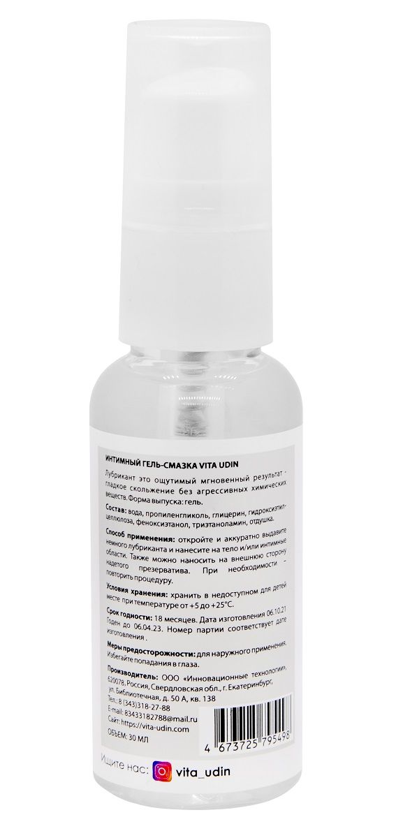 Лубрикант для влюблённых VITA UDIN принесёт яркое наслаждение и максимум удовольствия. Интимный гель-смазка добавит в ваши отношения нотку лёгкости и страсти. Не имеет отталкивающего резкого запаха. Смазка на водной основе, соответственно, не оставляет следов на белье, одежде и смывается обычной водой. Не доставит вам никаких дополнительных неудобств!
