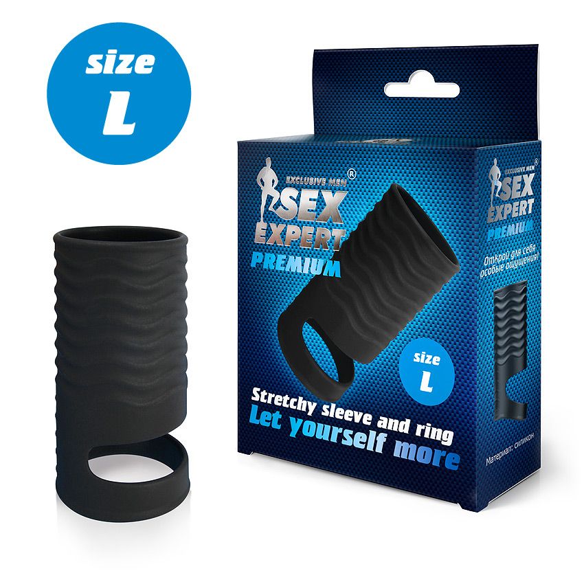 Открытая насадка на пенис с кольцом для мошонки L-size 8,5 см черная