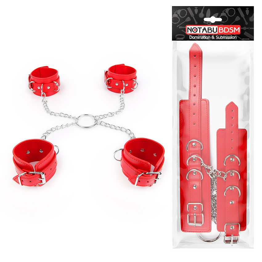 Комплект красных наручников и оков на металлических креплениях с кольцом - lovestoryshop.ru