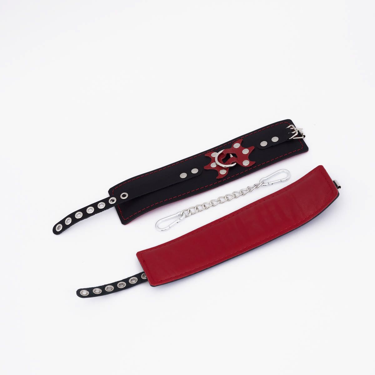Черные кожаные оковы с красным декором и строчкой