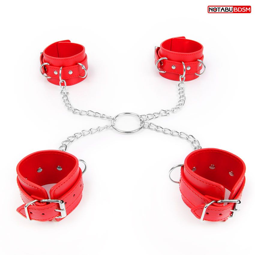 Комплект красных наручников и оков на металлических креплениях с кольцом - lovestoryshop.ru