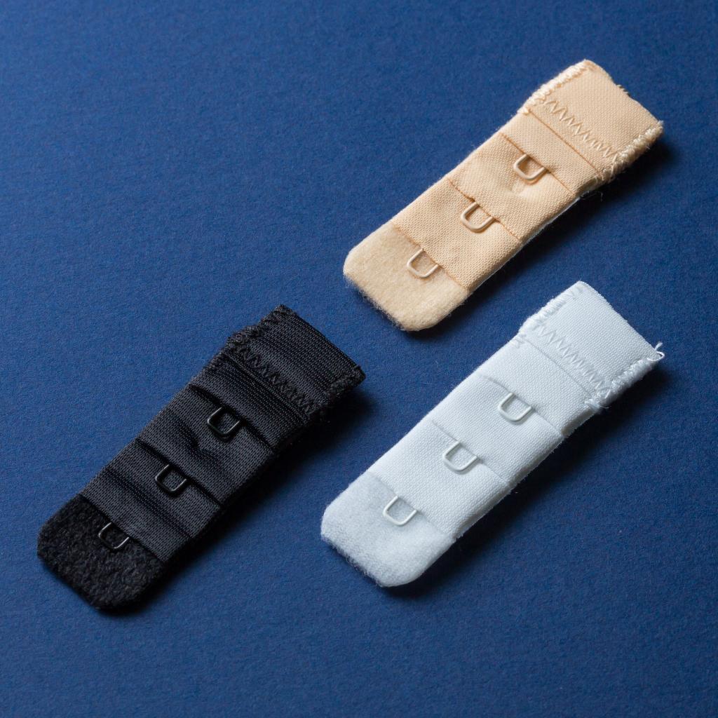 Набор из 3 разноцветных удлинителей для бюстгальтера шириной в 1 крючок: белого, черного и телесного цвета.