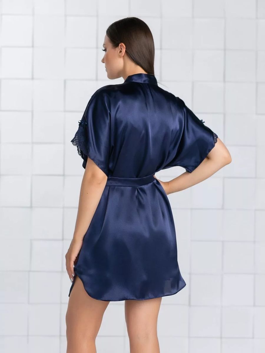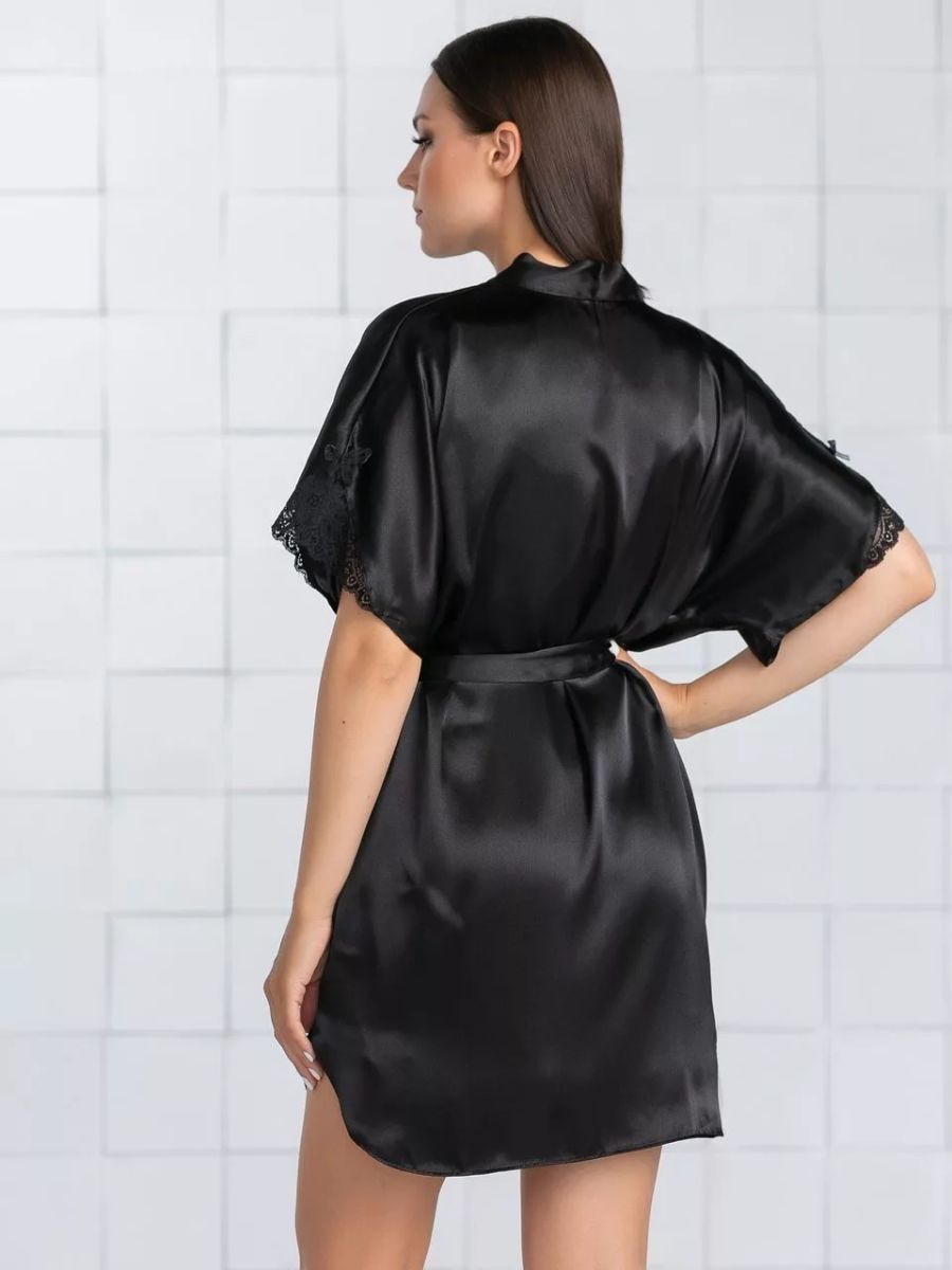 Короткий халат на запах из искусственного шелка, декорирован кружевом по рукаву.