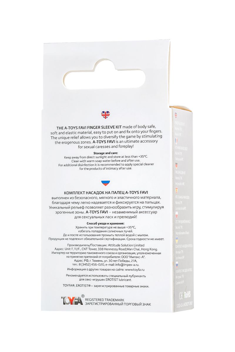 Комплект насадок на палец A-Toys Favi выполнен из безопасного, мягкого и эластичного материала, благодаря чему легко надевается и фиксируется на пальцах. Уникальный рельеф позволяет разнообразить игру, стимулируя эрогенные зоны. A-Toys Favi – незаменимый аксессуар для сексуальных ласк и прелюдий!