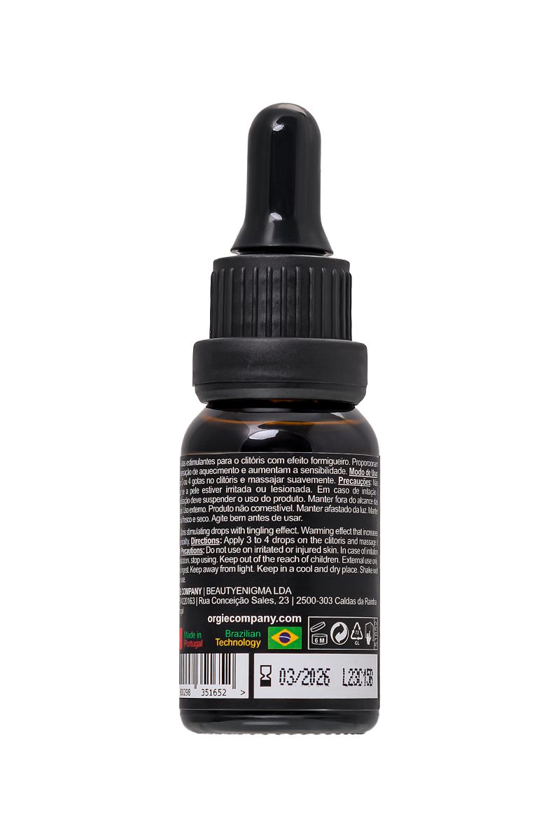 Как использовать капли Orgasm Drops Vibe? Просто нанесите 2 или 3 капли непосредственно на клитор, проведите нежный массаж и дайте несколько минут волшебству раскрыться. Легкое охлаждение вначале, затем нежное согревание и внезапная вибрация – это ваш путь к нирване удовольствия. Для более деликатного воздействия не превышайте дозировку - 1 капля. Orgie уважает ваши чувства и комфорт, и поэтому рекомендует начинать знакомство с продуктом с одной капли. Роскошный стеклянный флакон с капельницей позволяет контролировать расход средства. Объем 15 мл рассчитан приблизительно на 75 доз.
