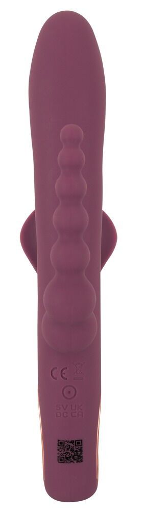 Сливовый вибратор с клиторальным отростком и анальным хвостом Slim Triple Plum - 21,4 см.