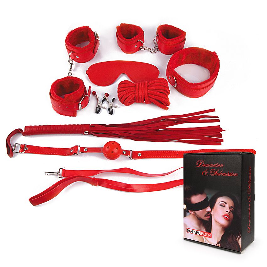 Великолепный набор аксессуаров для любителей БДСМ. В комплект входят наручники, оковы, маска, кляп, плеть, ошейник с поводком, верёвка, зажимы для сосков. Кляп, наручники, оковы, ошейник и маска снабжены специальной внутренней накладкой, предотвращающей натирание кожи. Также изделия имеют возможность регулирования размера. Плеть-флоггер состоит из хвостов и удобной рукоятки с металлическими вставками и петлей для подвешивания на крючок. Кляп оснащен шариком с отверстиями для дыхания. В комплекте: наручники, оковы, маска, кляп, плеть, ошейник с поводком, верёвка, зажимы для сосков.