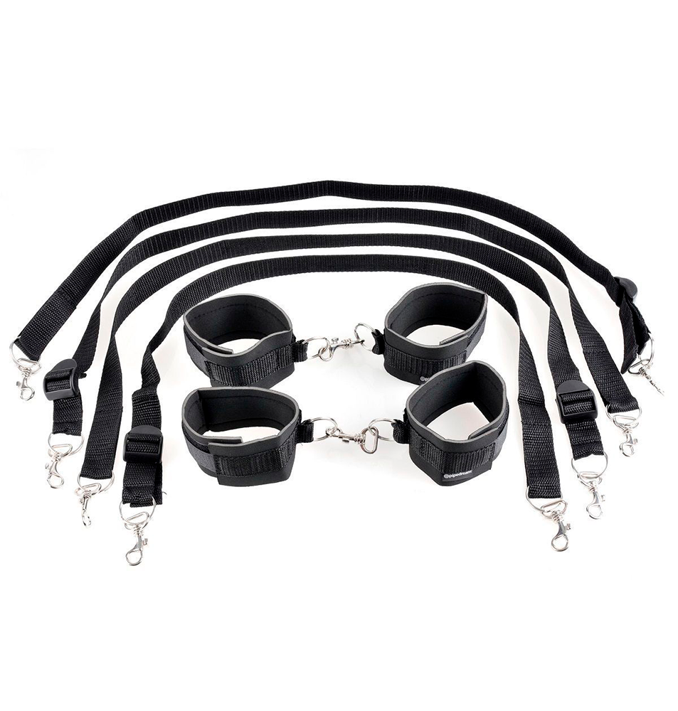 Набор фиксаций для кровати Cuff & Tether Set позволит разнообразить ваши ролевые игры в спальне, захватив вашего партнера в соблазнительных плен мягких оков. Комплект включает в себя эластичные ленты из нейлона, которые можно расположить на столбиках и у изголовья кровати или закрепить на иных местах или предметах мебели, которые покажутся вам удобными и устойчивыми. Затем на эти ленты нужно закрепить наручники и оковы при помощи карабинов, а затем — захватить вашего партнера в добровольное подчинение. Оставьте вашего партнера в зафиксированной позе и и исполняйте самые заветные желания друг друга.