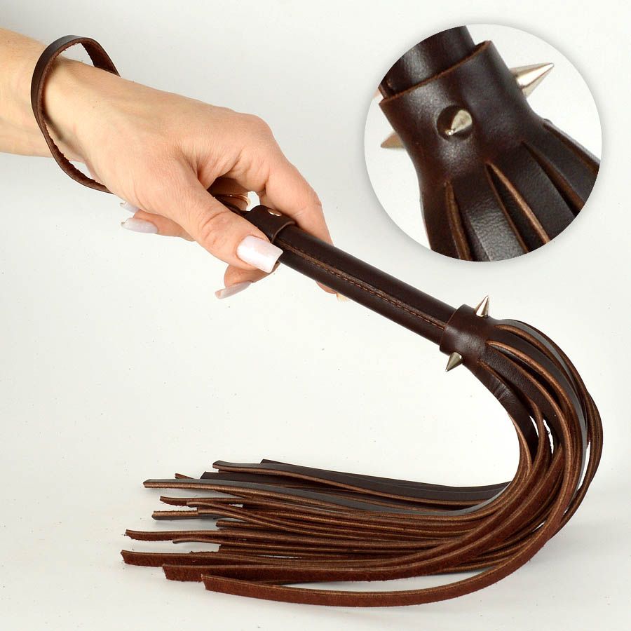 Коричневая кожаная мини-плеть с шипами - 40 см. - lovestoryshop.ru