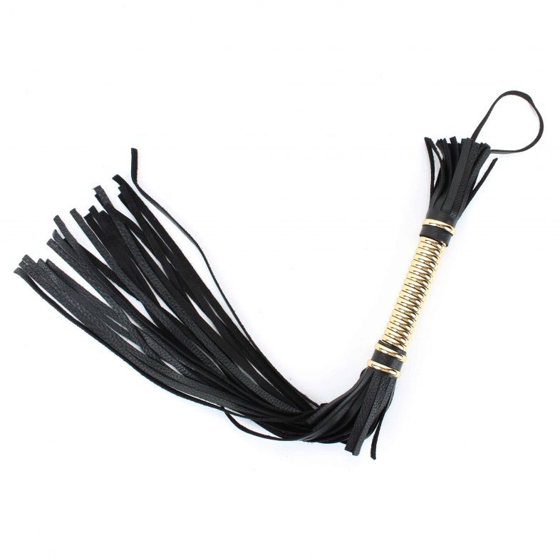 Плеть выполнена из натуральной кожи черного цвета. Стильная витая рукоятка золотого цвета, мягкие хвосты аксессуара доставят незабываемое впечатление, позволят партнерам воплотить самые сокровенные желания. Для удобства на рукоятке расположена петелька. Длина рукояти - 16 см.