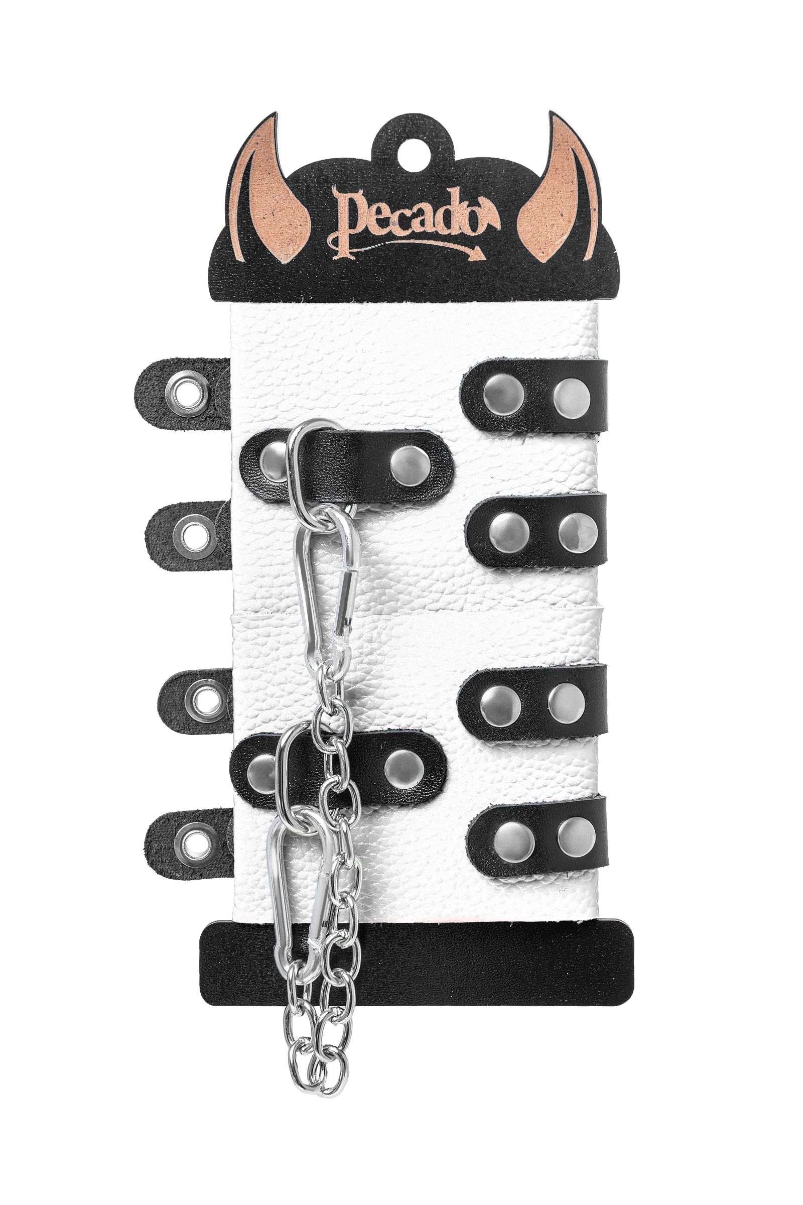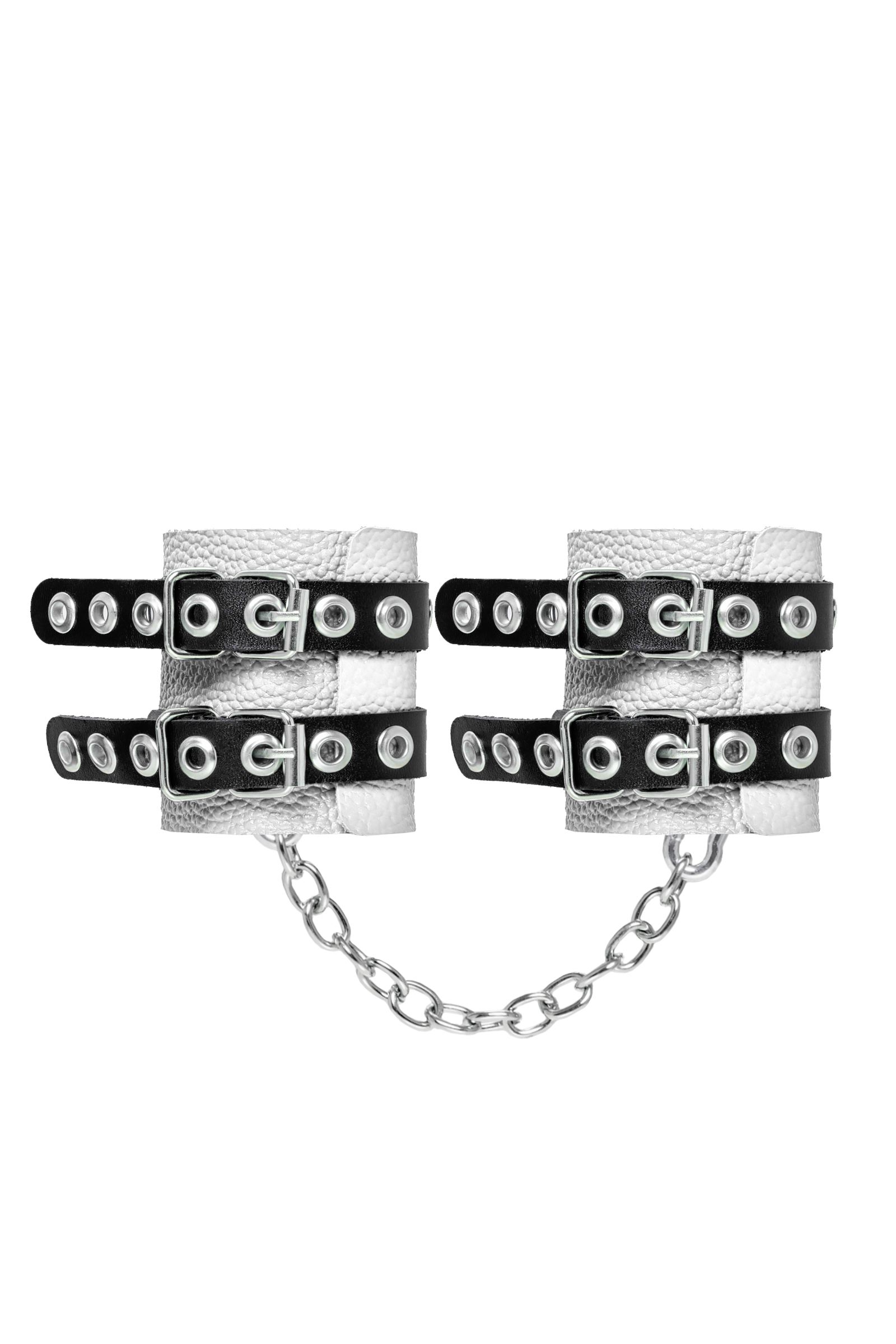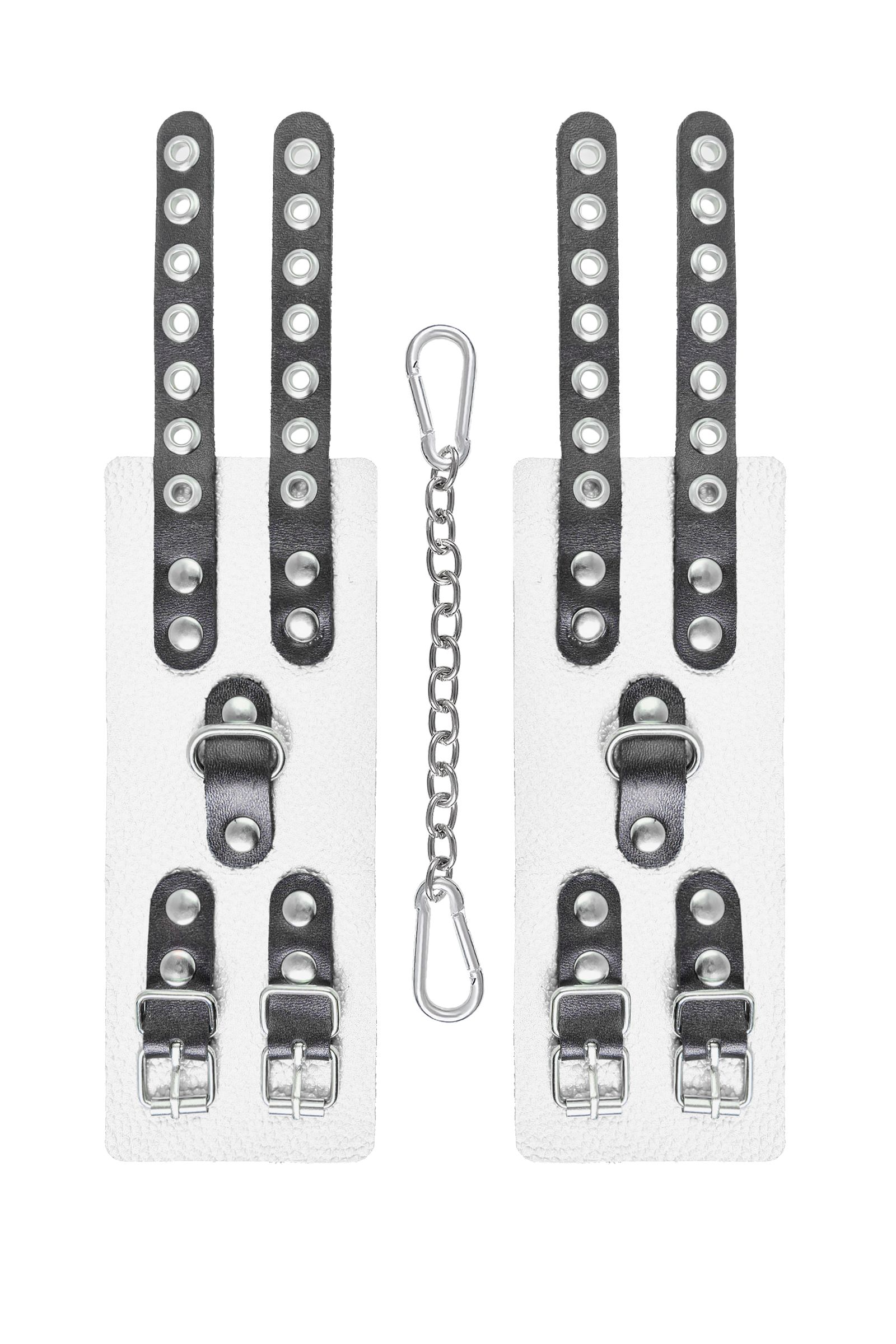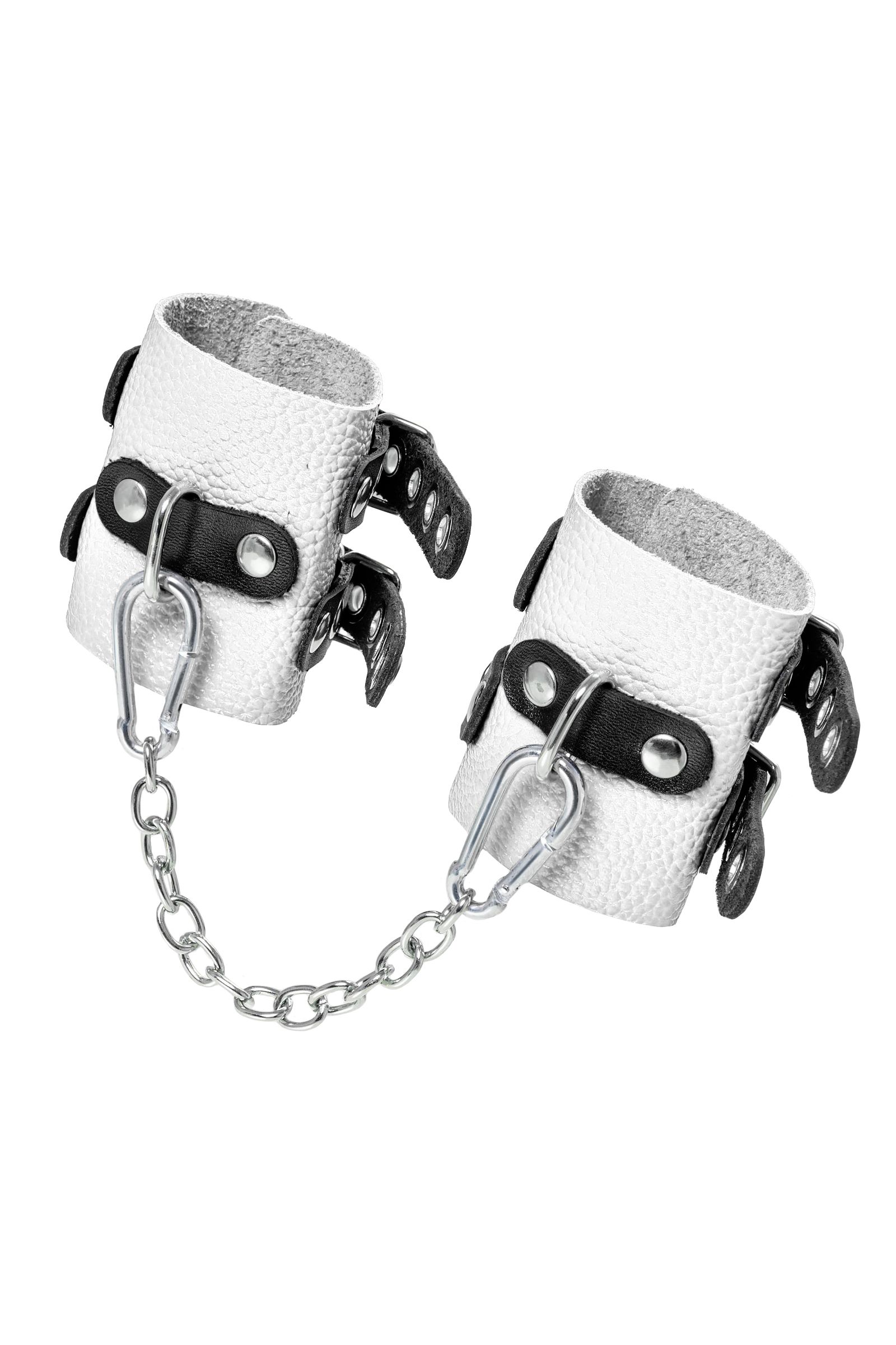 Основатели бренда уверены: лучший способ избавиться от искушения - поддаться ему! Мягкие, белые, кожаные наручники с двумя чёрными, жёсткими ремнями могут стать стильным аксессуаром, а могут послужить вашим целям по своему прямому назначению. Частичное обездвиживание и невозможность двигать руками дают вам полную власть над партнером – взрослые игры для взрослых. Наличие двух колец и карабинов, соединенных между собой металлической цепочкой, позволяет использовать изделие как раздельно – аксессуар-манжеты, так и как наручники для фиксации. К широким металлическим кольцам также можно присоединить и другие аксессуары при помощи карабинов. Благодаря универсальному размеру наручники могут использоваться и мужчинами, и женщинами. Длина манжет - 18 см, ширина - 7 см.