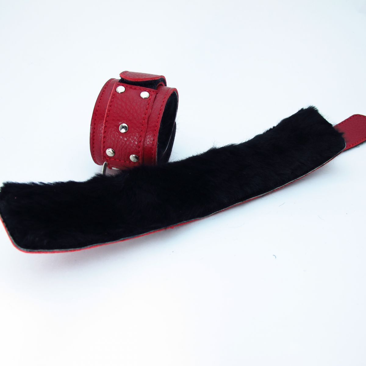 Кожаные наручники красного цвета. Украшены заклепками и соединяются между собой цепью с карабинами. Внутренняя часть наручников отделана черны мехом. Размер наручников регулируется при помощи застежки-липучки. Ширина - 5 см.