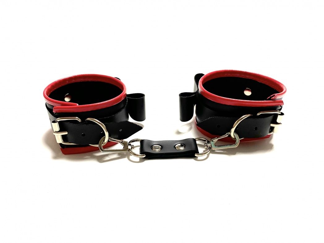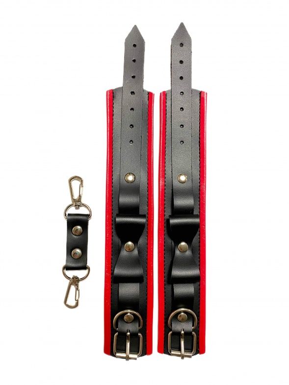 Красивые и функциональные наручники, выполненные из искусственной кожи. Декорированы металлической фурнитурой, лаковыми бантиками и красными вставками по краям. Обхват удобно регулируется с помощью пряжек. В комплекте идет соединение с карабинами. Очень экономичный, экологичный и практически незаменимый аксессуар для вашей любовной игры! Ширина - 4,5 см.