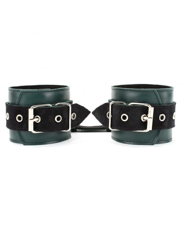 ОписаниеНаручники выполнены из натуральной кожи цвета бордо. Изделие декорировано ремнями из замши черного цвета. Обратная сторона изделия тоже выполнена из черной замши. По середине наручника расположено полукольцо из сварной фурнитуры. Наручники надежно фиксируются пряжками и ремнями, позволяющими выбрать нужный размер, подойдут на обхват руки от 16 до 25 см. Кожаное соединение на карабинах фиксирует наручники вместе. Стильные наручники отлично подходят для воплощения эротических БДСМ игр.
