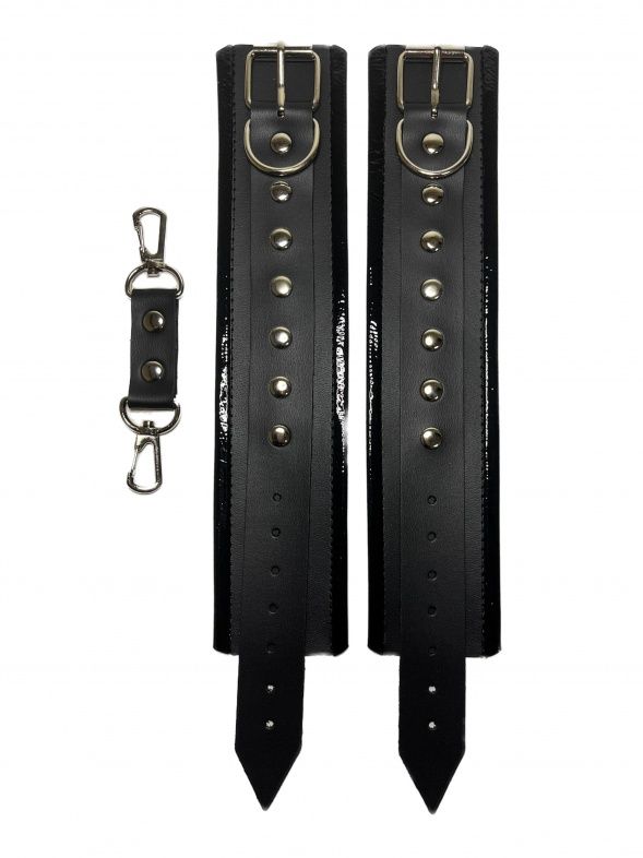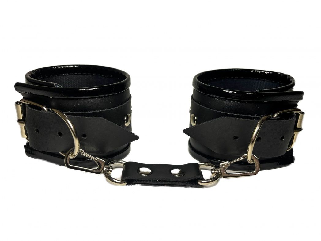Красивые и функциональные наручники черного цвета, выполненные из искусственной кожи. Декорированы металлической фурнитурой и лаковыми вставками по краям. Обхват удобно регулируется с помощью пряжек. В комплекте идет соединение с карабинами. Очень экономичный, экологичный и практически незаменимый аксессуар для вашей любовной игры! Ширина - 5,5 см.