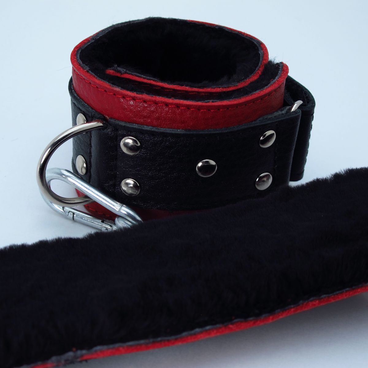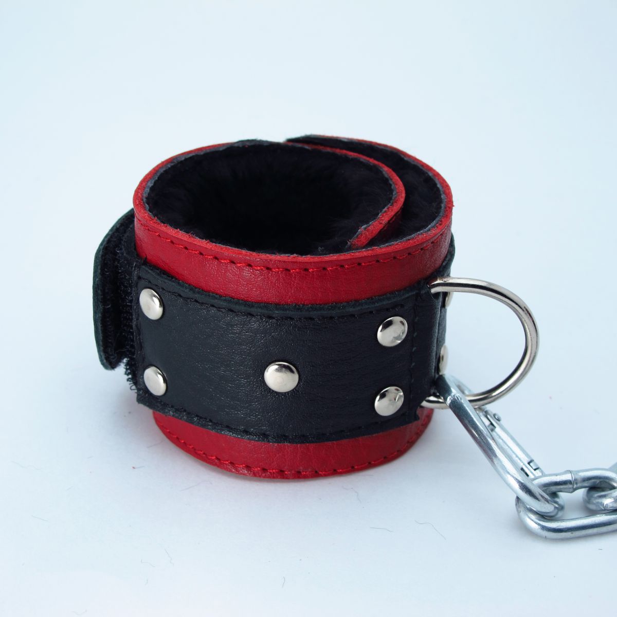Кожаные наручники красного цвета. Украшены заклепками и соединяются между собой цепью с карабинами. Имеет вставку черного цвета на лицевой части и отделаны мехом с внутренней части. Размер наручников регулируется при помощи застежки-липучки. Ширина - 5 см. Длина цепочки - 15,5 см.