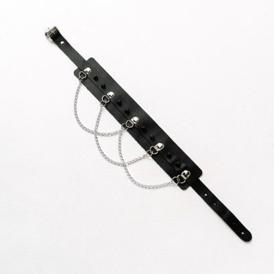 Чокер из натуральной кожи снабжен шипами и декорирован металлическими цепочками.