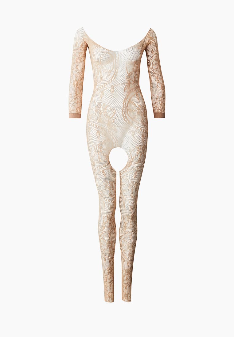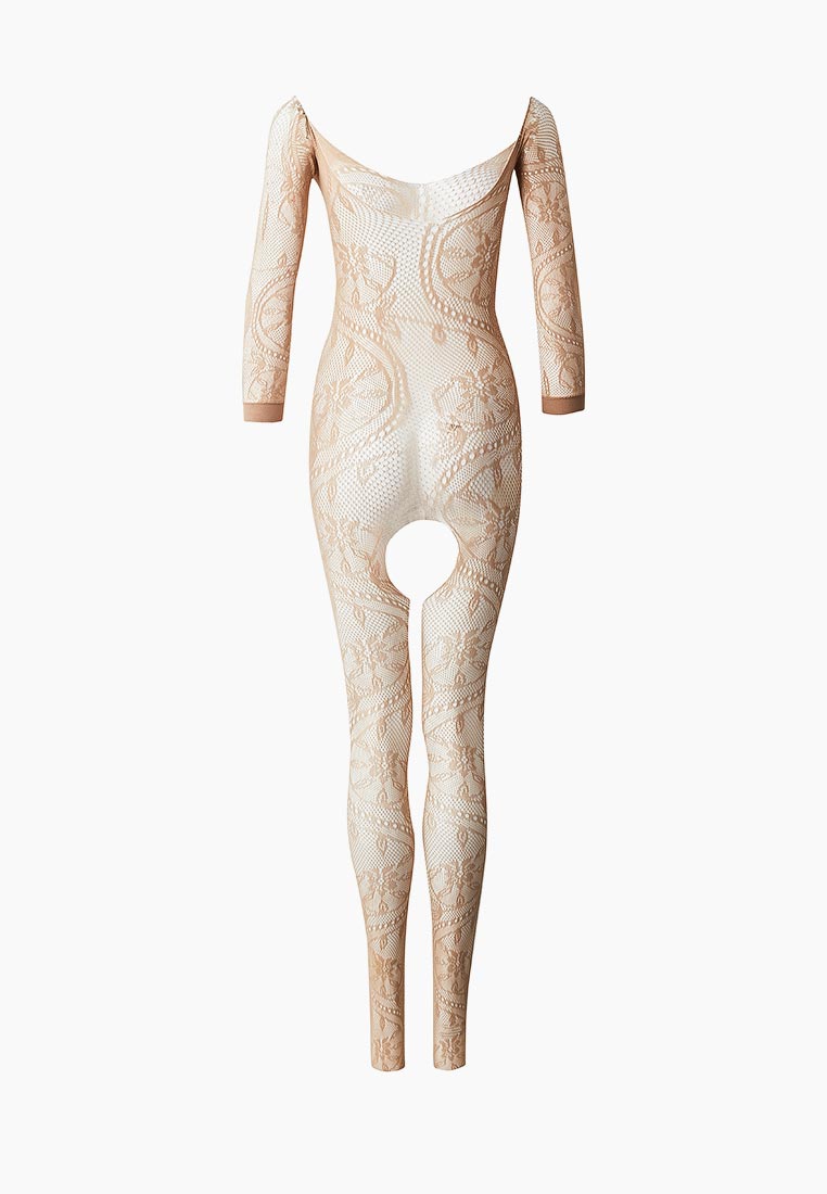 Бежевый комбинезон с замысловатым узором и короткими рукавами. С интимным доступом. Нежный, приятный на ощупь материал позволит вам чувствовать себя комфортно, а уникальный дизайн модели не даст отвести от вас взгляд. Благодаря уникальному пошиву и дизайну боди-комбинезон визуально стройнит фигуру, а также подчеркивает все самые аппетитные части тела.