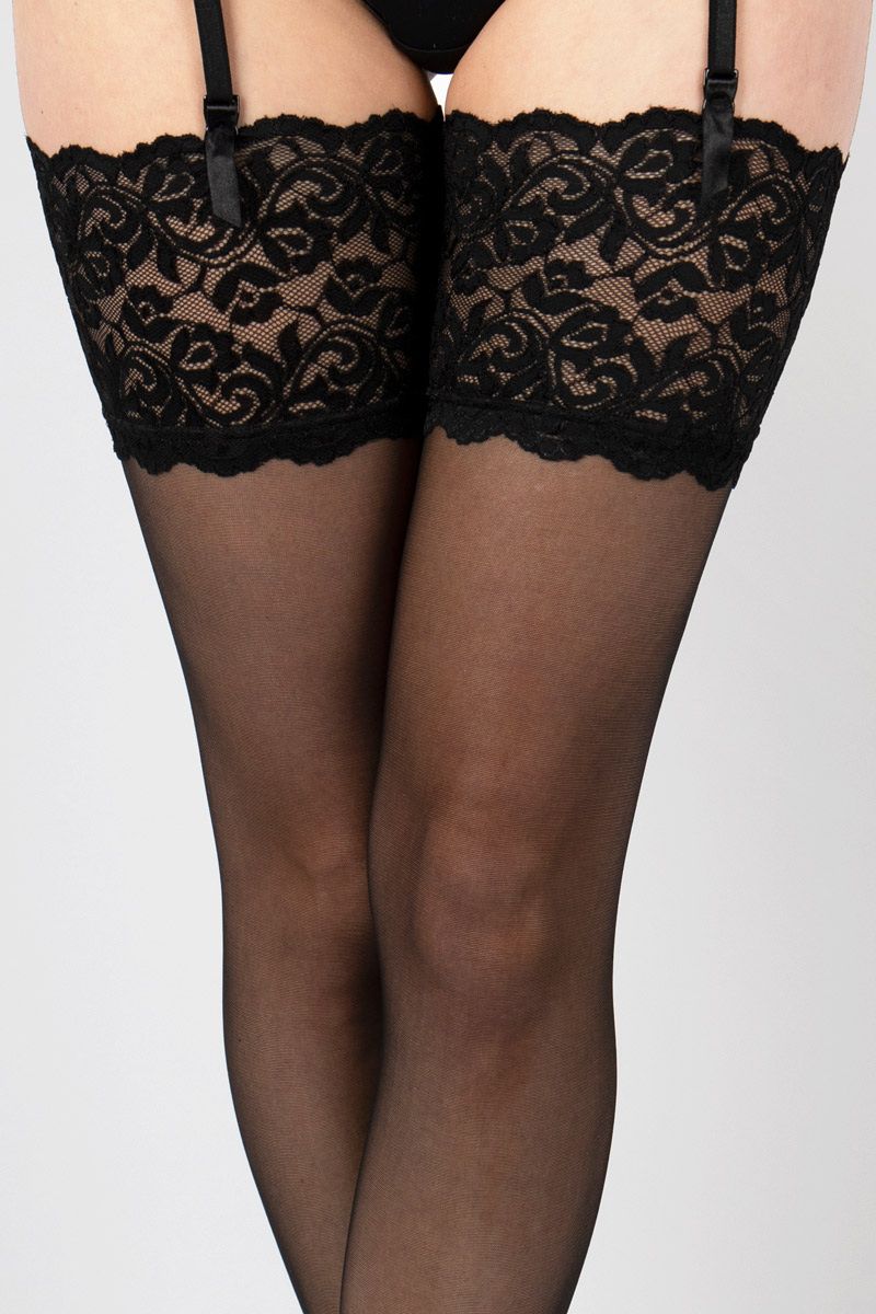 ОписаниеЧулки под пояс на широкой ажурной резинке. Плотность - 10 ден.