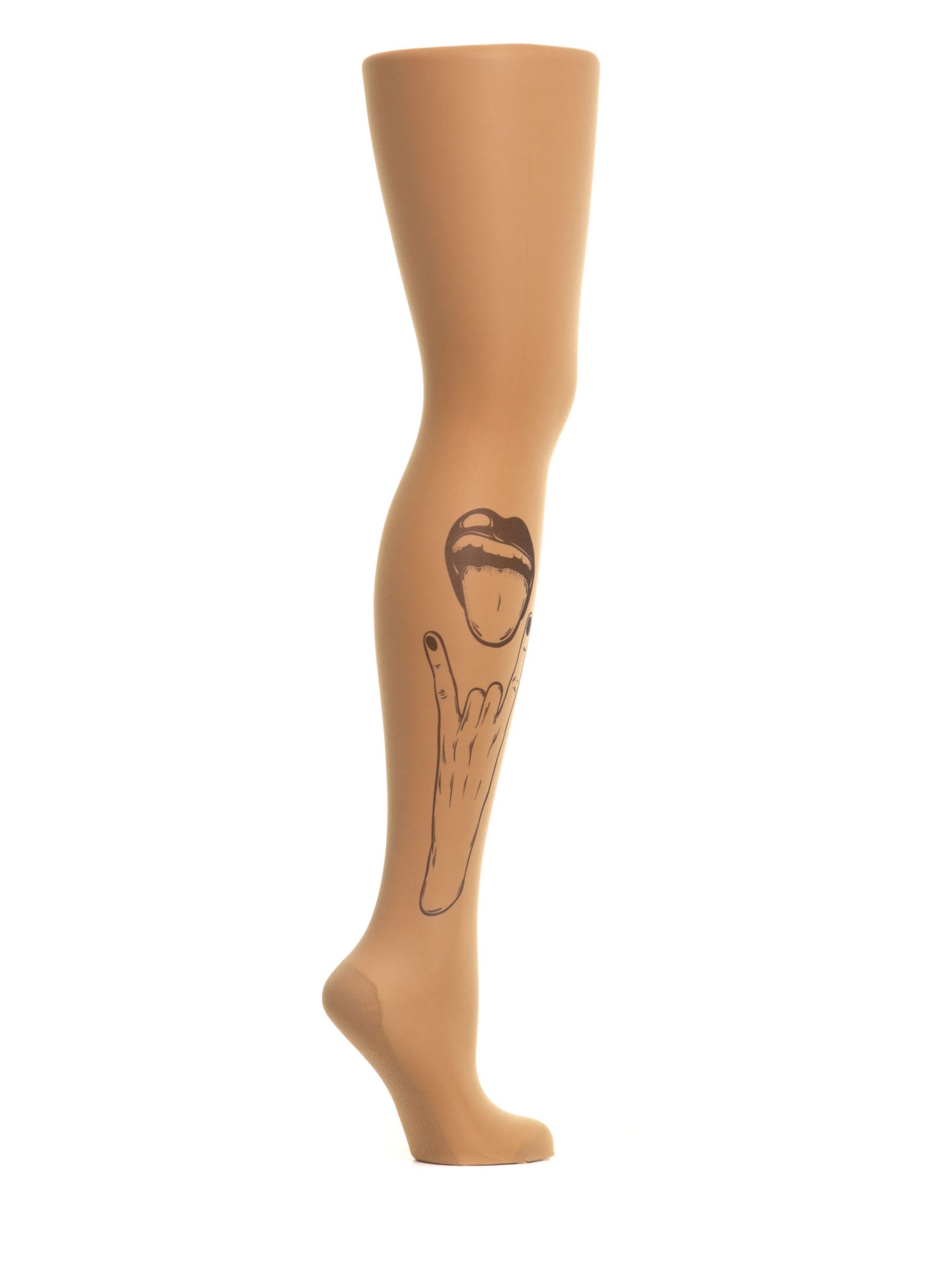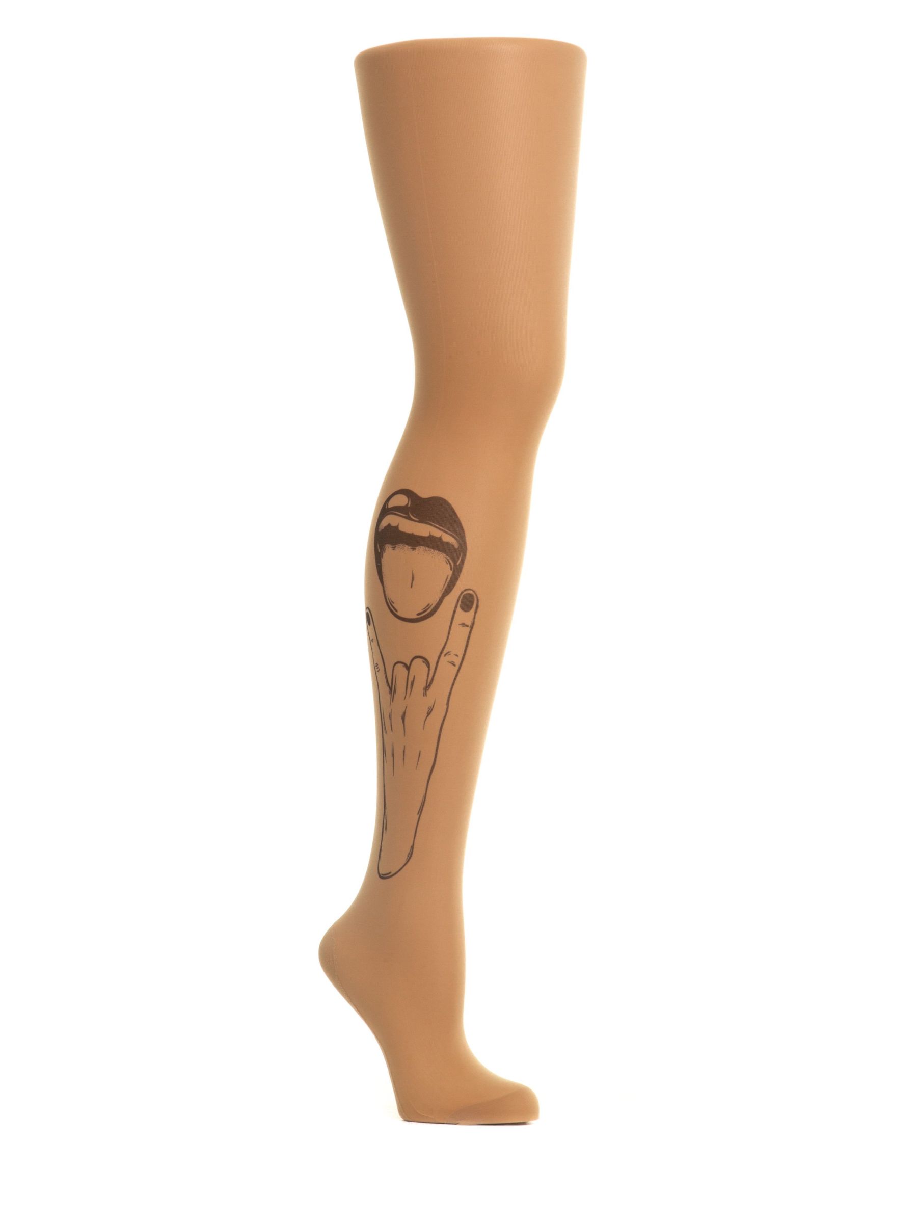 Колготки с принтом в виде жеста-«козы». Принт не стирается, не выгорает со временем. Можно стирать в стиральной машине. Крепкие, подойдут на рост от 145 до 180 см. Плотность - 40 ден.