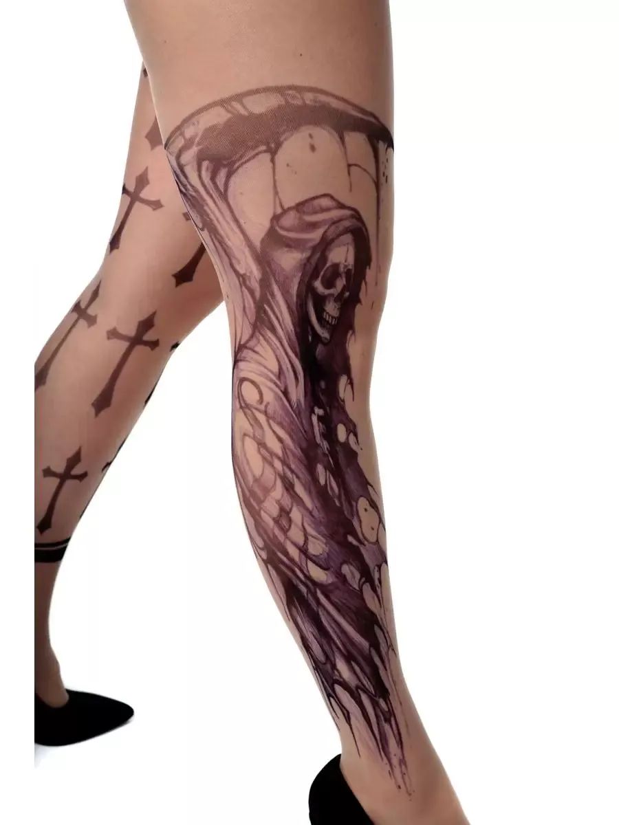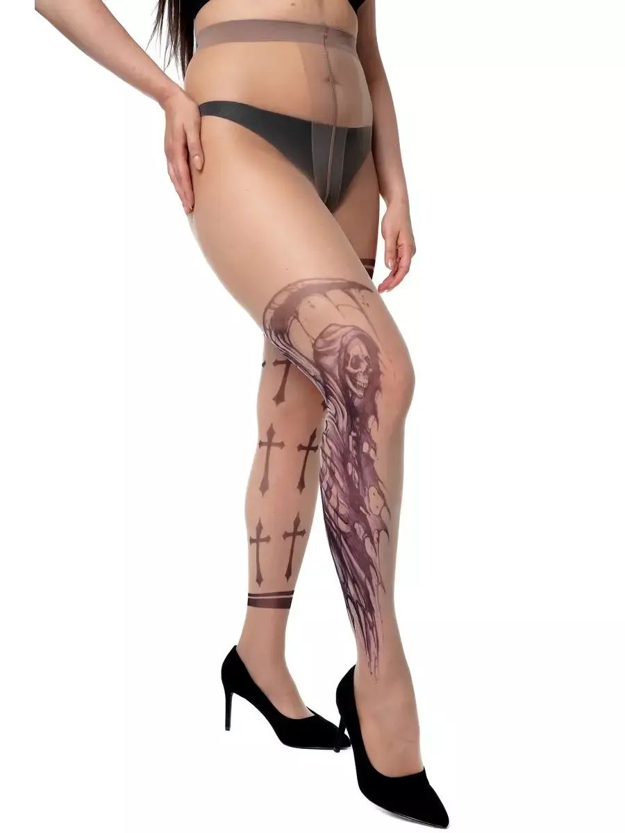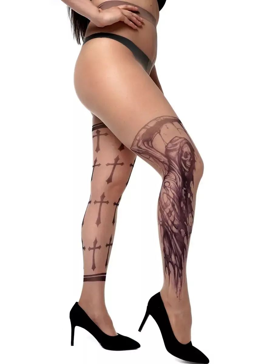 Колготки +size с принтом в виде смерти и крестов. Принт не стирается, не выгорает со временем. Можно стирать в стиральной машине. Крепкие, подойдут на рост от 145 до 180 см. Плотность - 40 ден.
