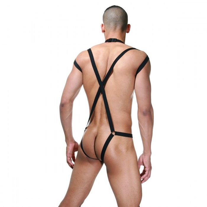 Невероятное боди, из гладкой блестящей черной ткани. Абсолютно открытые ягодицы, соблазнительное переплетение ремней на груди и плечах, застежка на шее сзади.