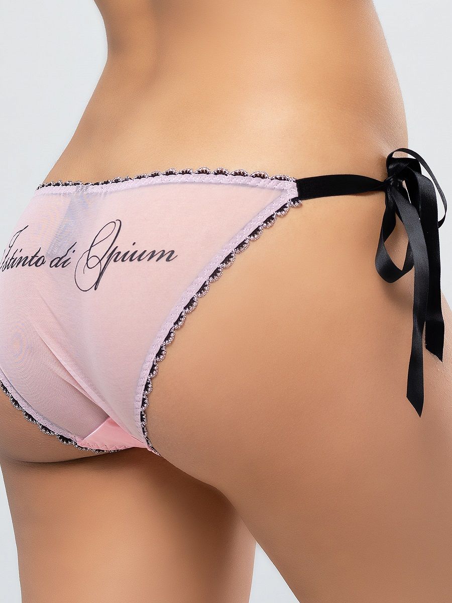 Слипы из комбинированной атласной и сетчатой ткани, завязываются по бокам на атласные ленты. Сзади контрастный принт с логотипом бренда. Богато украшен кружевом. Спереди очаровательный бантик с миниатюрной розочкой.