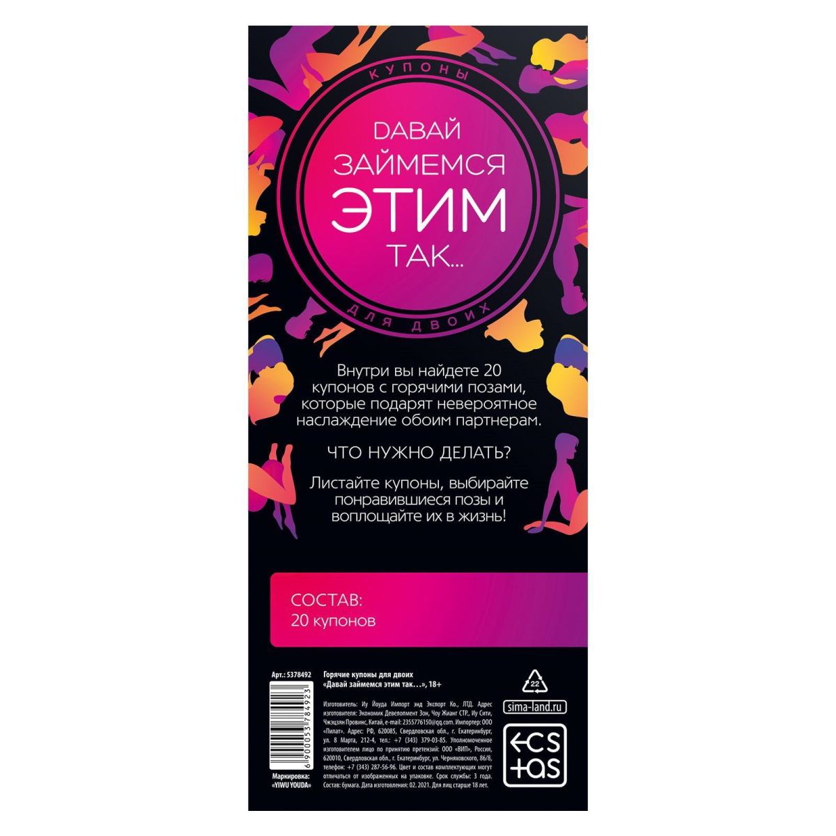 Горячие купоны для двоих. Хотите попробовать что-то новенькое и добавить в сексуальную жизнь перчинки? Тогда эти купоны — именно то, что вам нужно. Внутри вас ждут 20 самых горячих и соблазнительных поз, которые подарят наслаждение обоим партнёрам. Как использовать купоны? На одной странице вас ждёт иллюстрация позы, на другой — её описание. Поэтому просто листайте страницы, выбирайте понравившиеся позиции и воплощайте их в жизнь! Дарите друг другу наслаждение! В комплекте: 20 купонов.