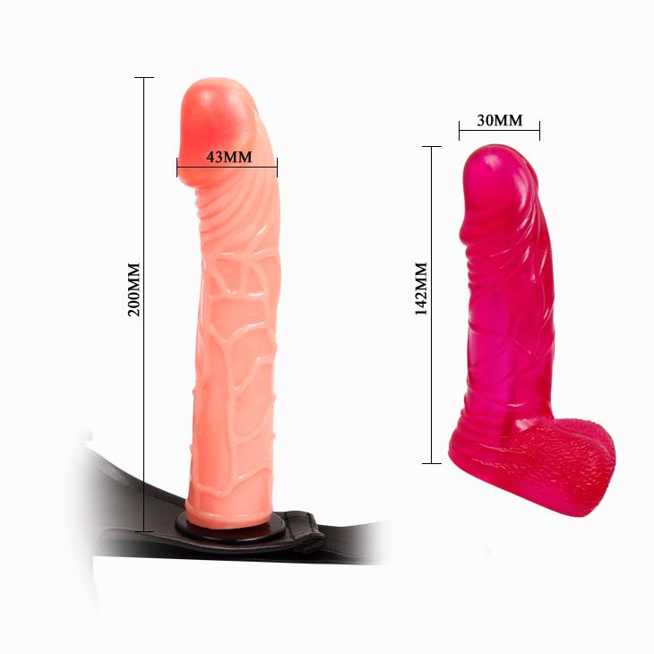 Женский страпон на ремешках с двумя насадками. Размер ремешков регулируется. Длина большого дилдо - 20 см., диаметр - 4,3 см.