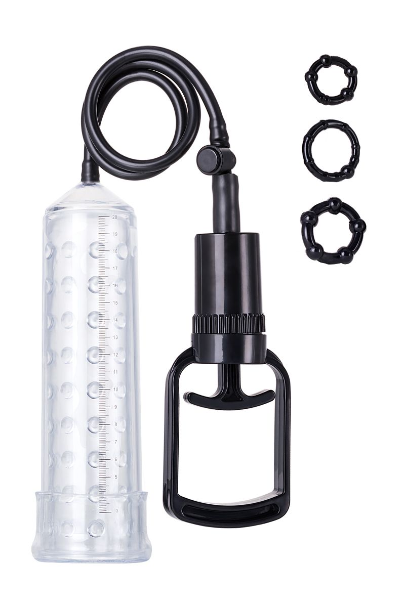 A-Toys Vacuum pump — серия помп, созданная для мужчин, которые стремятся к новым победам и точно знают чего хотя. Регулярное применение помп Atoys способствует увеличению размеров полового члена и усиливает эрекцию. Высокое качество материалов, используемых при производстве помпы, сделают применение изделия приятным и безопасным. Помпа оснащена мощным насосом. Кроме того, отличительной особенностью данной помпы является съемная мягкой вставка с рельефом в виде шариков, что позволяет дополнительно массировать пенис. В комплекте: помпа, 3 эрекционных кольца различного диаметра.