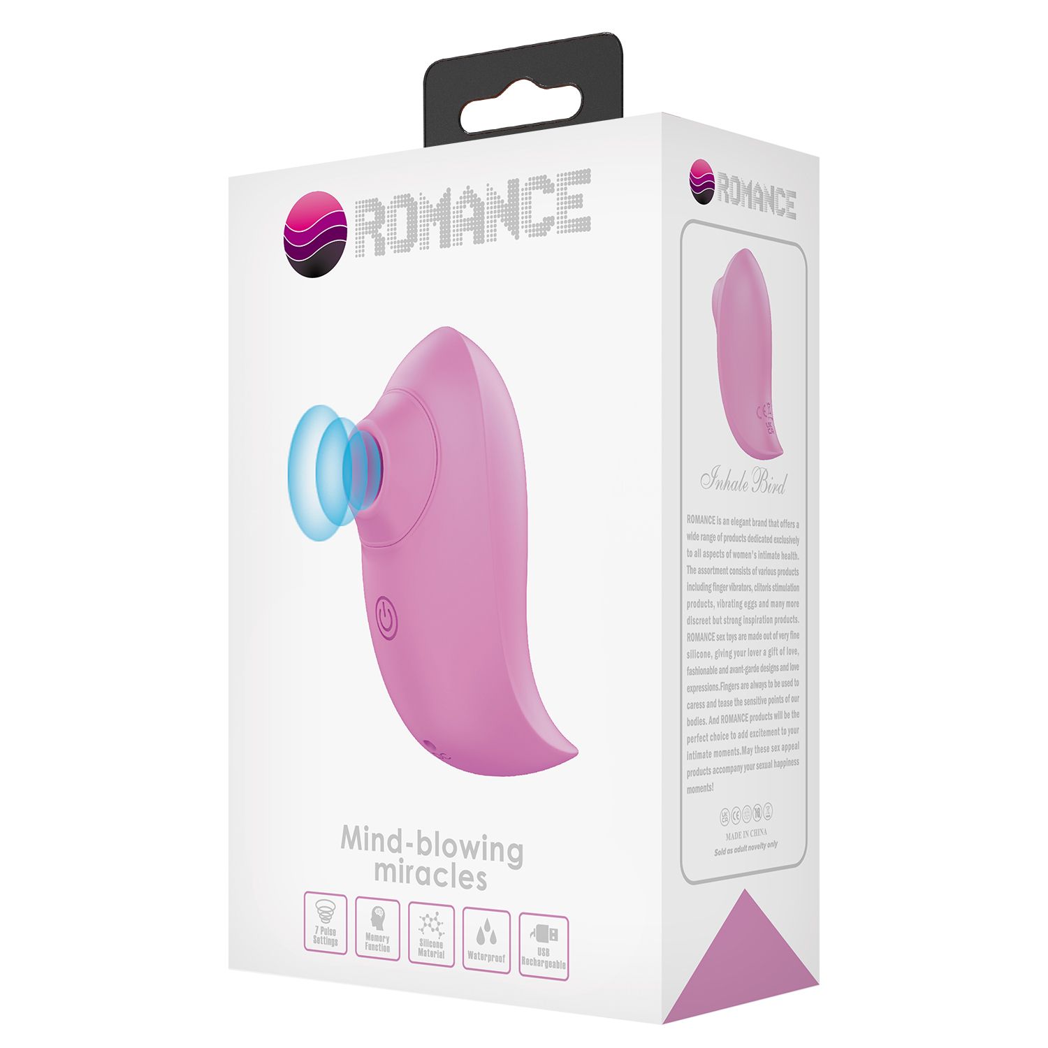 Розовый стимулятор клитора Inhale Bird. 7 режимов работы легко контролируются кнопкой на игрушке.