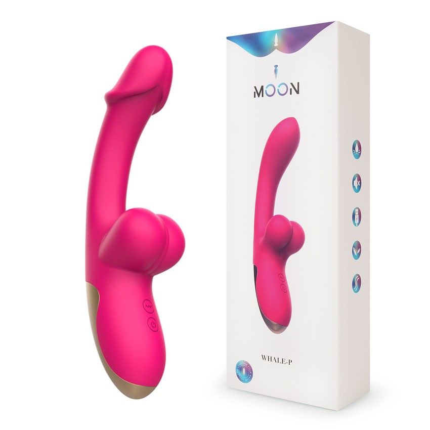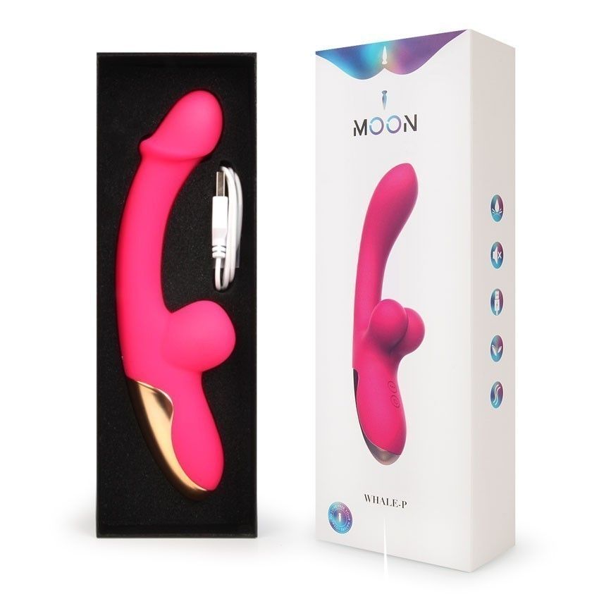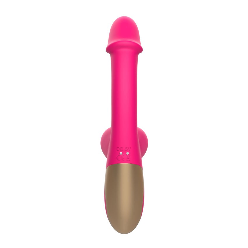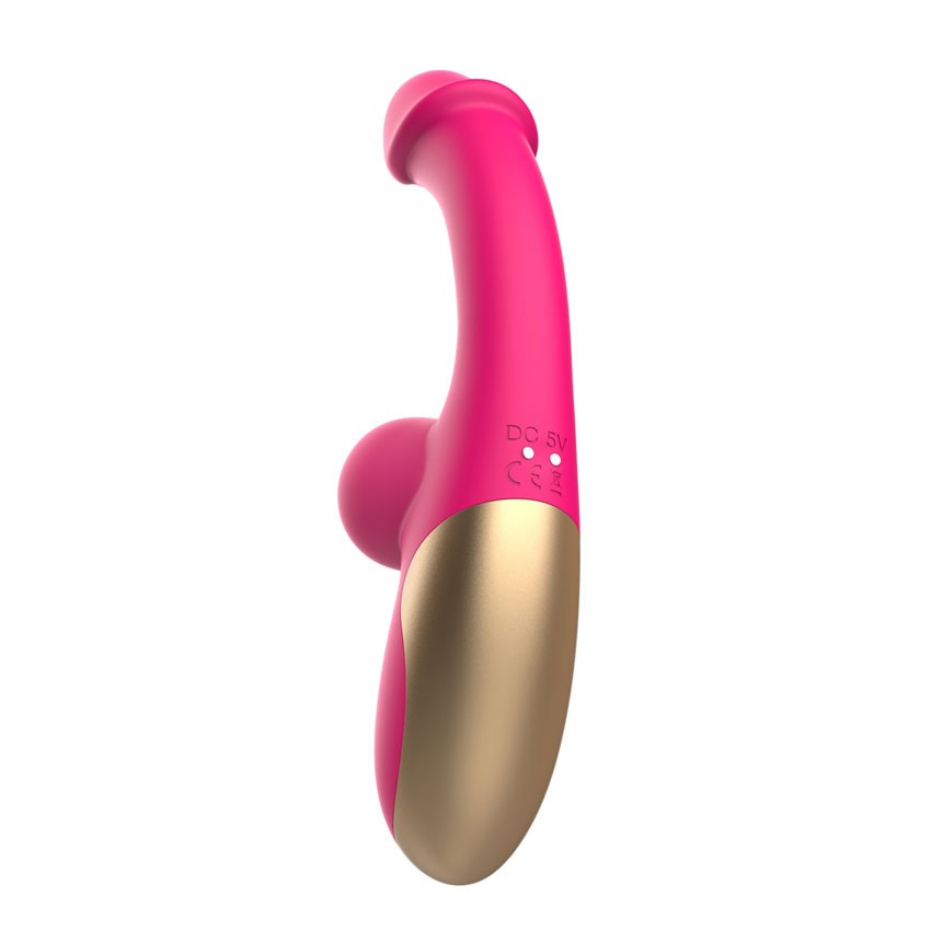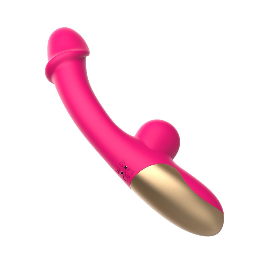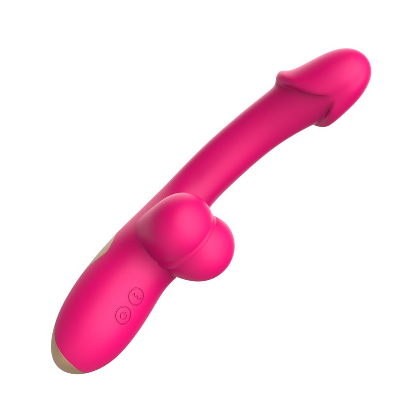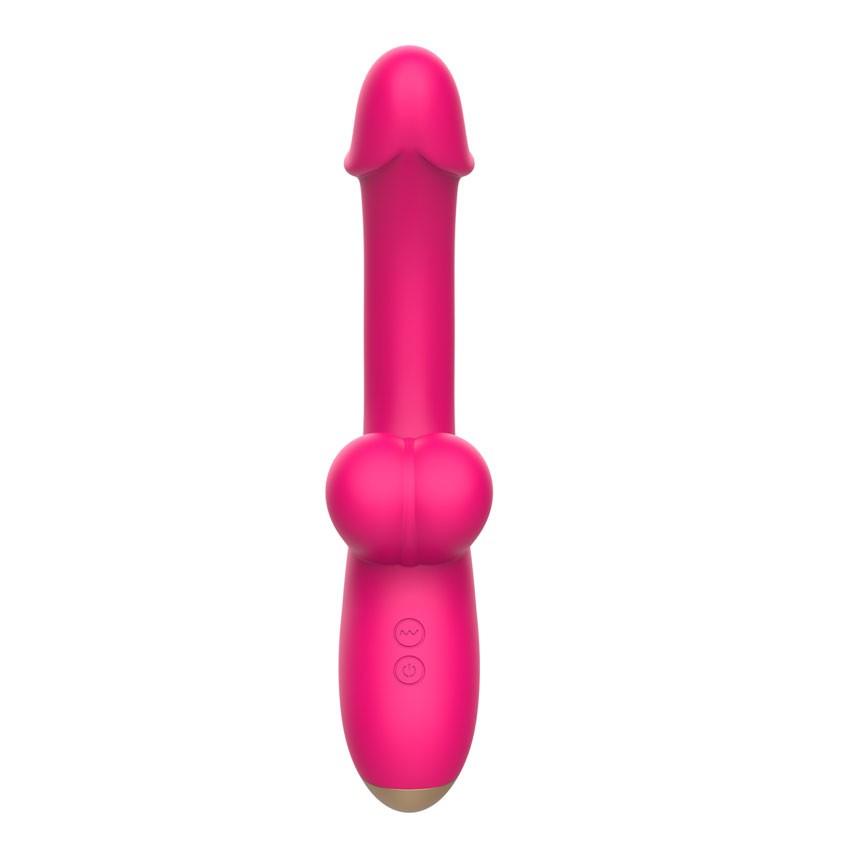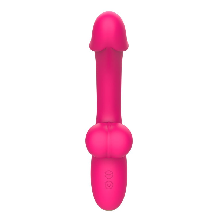 ОписаниеРозовый изогнутый вибромассажёр с имитацией мошонки. 10 режимов вибрации. Рабочая длина - 11 см.