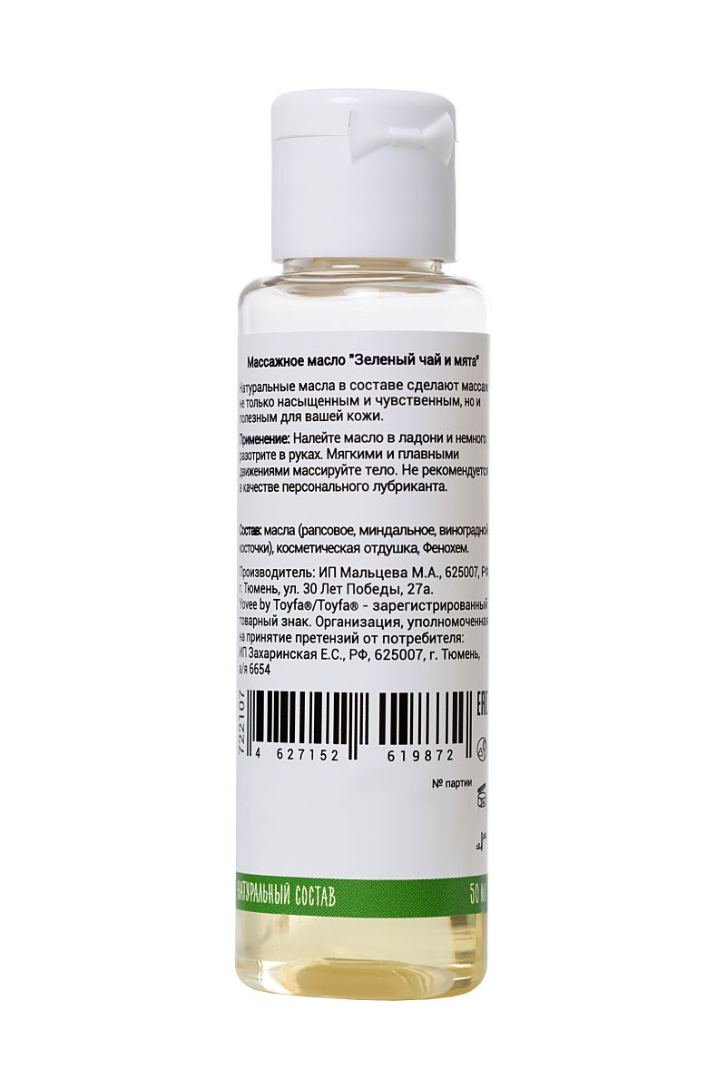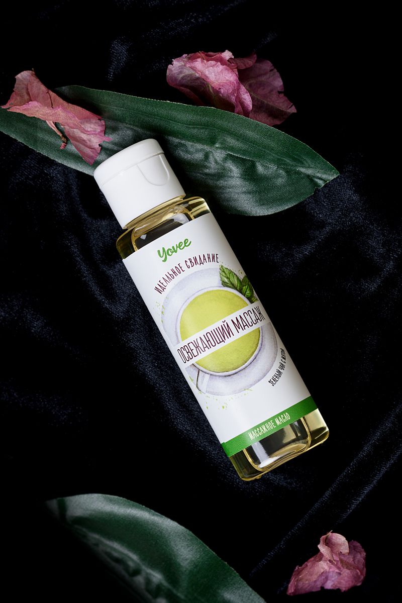 Натуральные масла в составе сделают массаж не только насыщенным и чувственным, но и полезным для вашей кожи. Отлично скользит и смывается водой. Аромат зелёного чая и мяты с лёгкостью расслабит и подготовит вас к чувственному массажу. Подготовьтесь к свиданию: после приёма расслабляющей ванны побалуйте себя ароматным массажем. Налейте масло в ладони и лёгкими массажными движениями массируйте своё тело. Освежающий аромат и натуральные масла в составе сделают вашу кожу приятной и мягкой.
